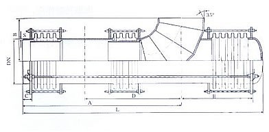 該膨脹節(jié)的兩端各有一個工作波紋管,中間有一個平衡波紋管,膨脹節(jié)通過受力構(gòu)件(大拉桿或舌管)來承受內(nèi)壓推力。因此管系只需中間固定支架,此類膨脹節(jié)只能吸收軸向位移。